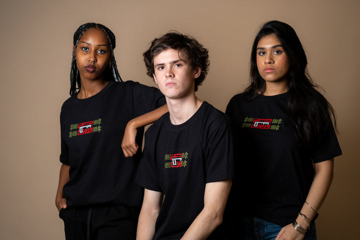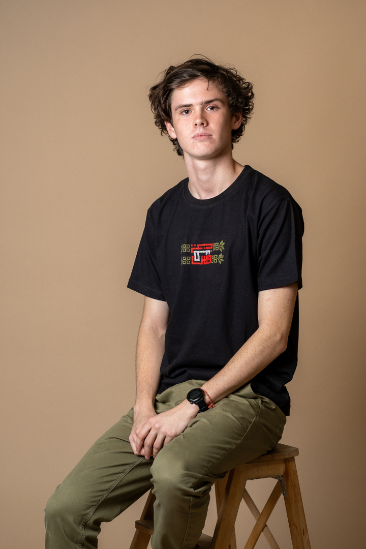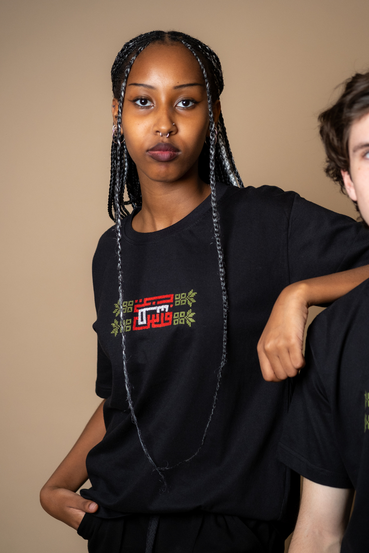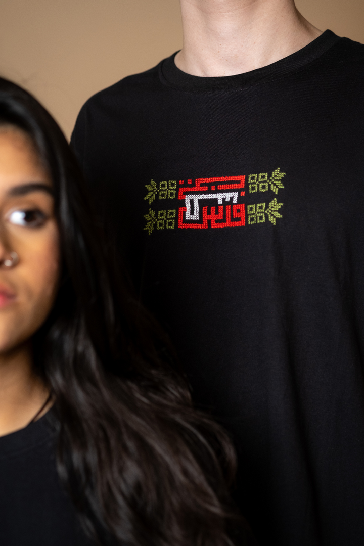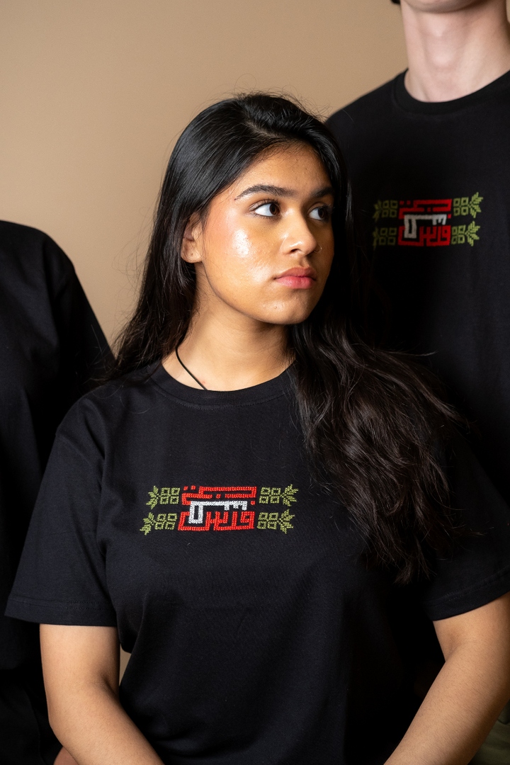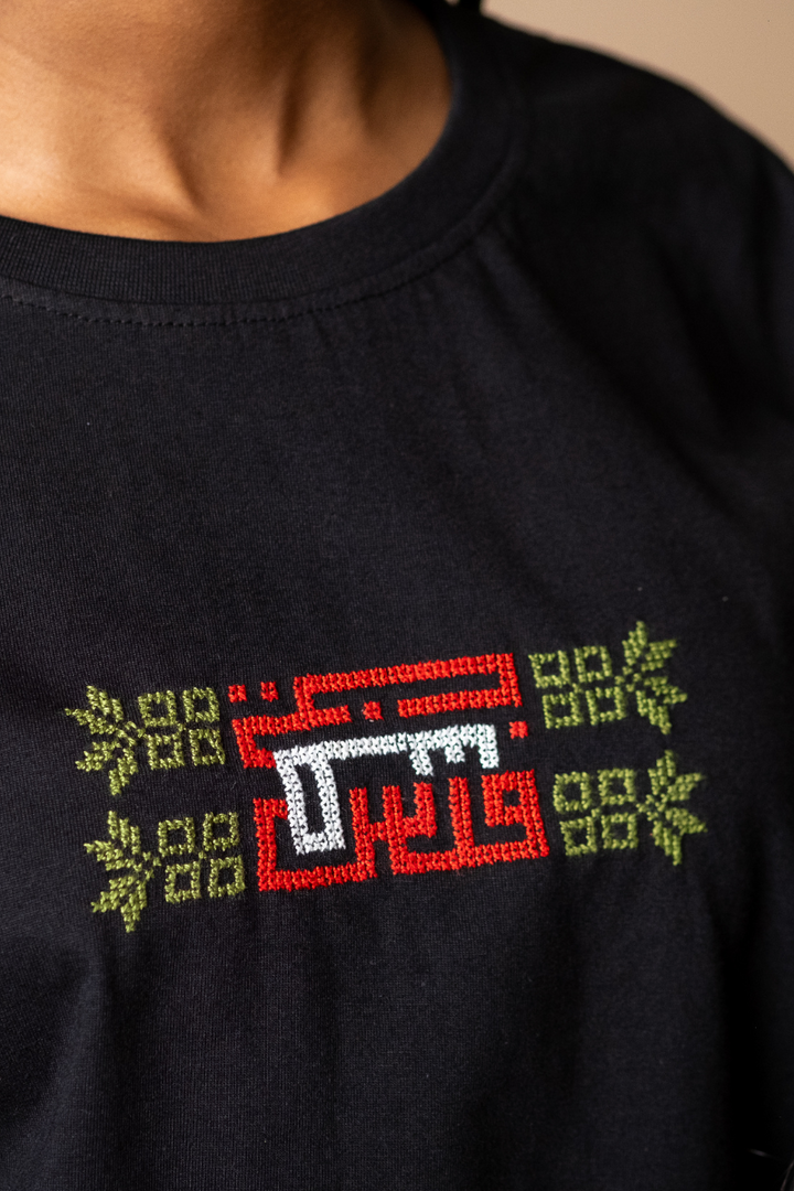 Hand-embroidered by women from Gaza, this soft black cotton T-shirt features Falasteen in bold Kufic script, stitched in the colors of the Palestinian flag. The letter uay (ط) is shaped as a key - a powerful symbol of the right of return and a future rooted in hope.
